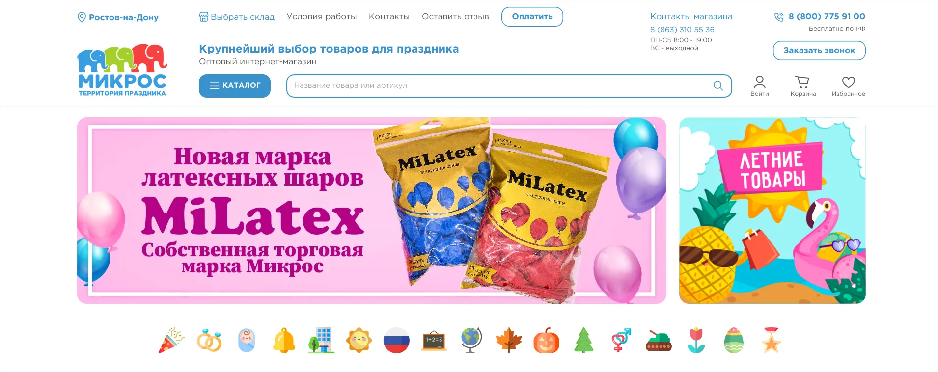 С годами мы накопили обширную клиентскую базу, которая охватывает всю Россию. Для удобства наших клиентов мы открыли оптовые магазины «Микрос. Территория праздника» в более чем двадцати городах России. Это позволяет сократить сроки доставки и дает возможность клиентам выбрать товар лично.